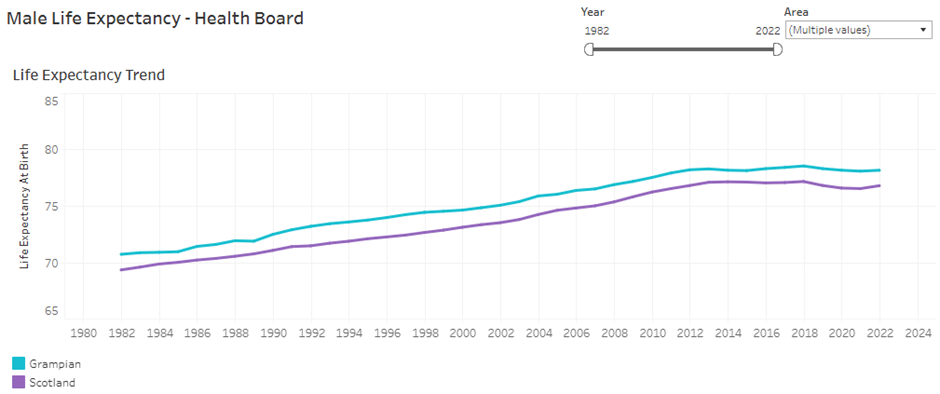 For the period 2021-23 male life expectancy in Grampian was 78.2 years compared to 76.8 years across Scotland. Female life expectancy was 81.9 years compared to 80.8 years across Scotland.