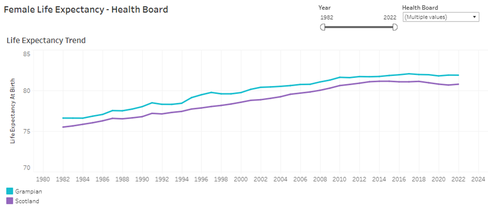 Life expectancy in Grampian in general is higher than the Scottish average. Differences in age trends for males and females are seen at both a Scottish and Grampian level, with female life expectancy being higher than male life expectancy.