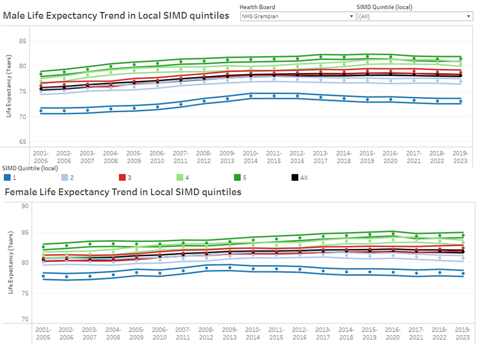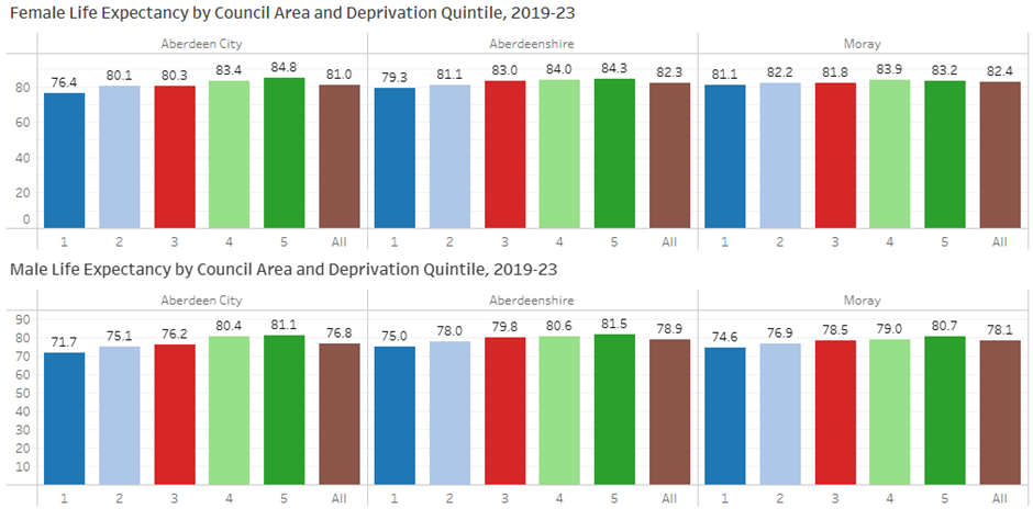 The impact of wider health determinants such as deprivation on life expectancy is well recognised and core to the Health Equity work outlined in the NHS Grampian Plan which aims to reduce the gap between the most deprived and least deprived communities. Male life expectancy is considerably lower in the more deprived quintiles, as illustrated below in Figure x.