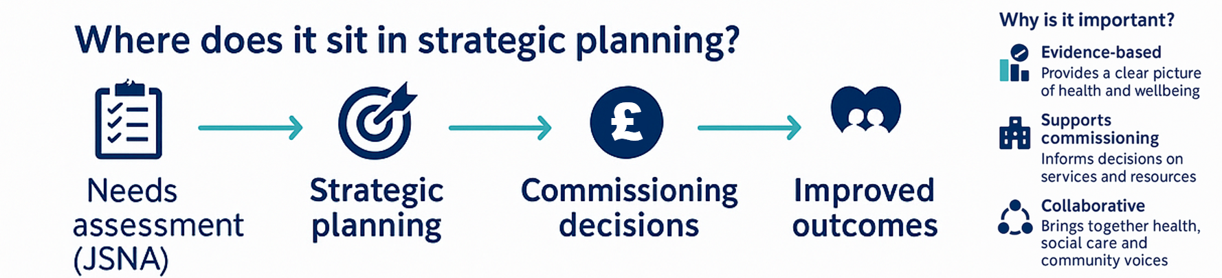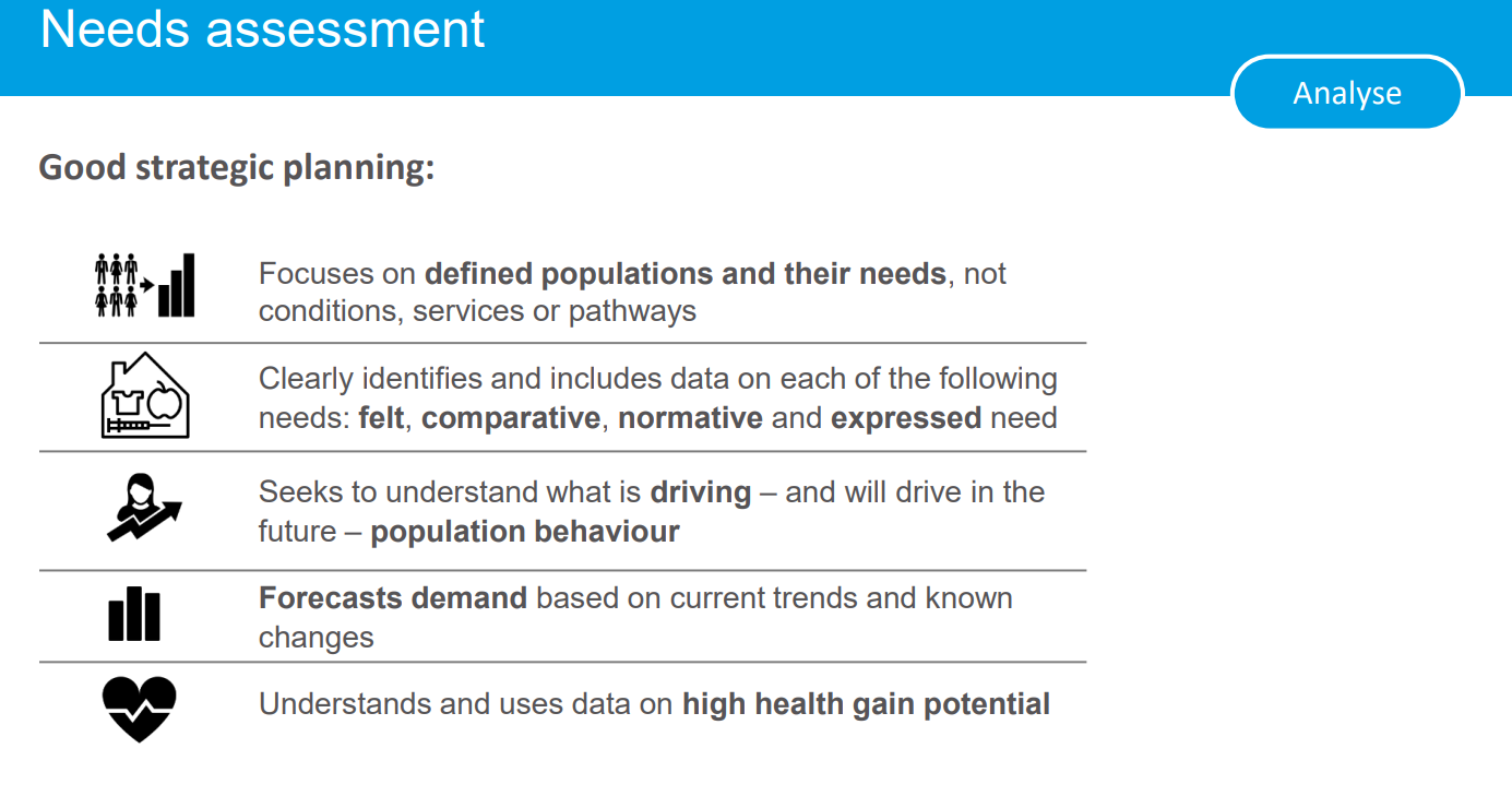 Needs assessments are a critical component to planning and commissioning and they enable us to plan with the population’s current and future need as our starting point, rather than the existing service and system. This means we aren’t limited to just continue our current approaches within planning, but are able to keep us accountable to the changing needs of the population we support.
