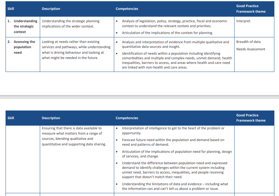 Information on needs assessment are included in the Good Practice Skills for Strategic Planning(Who we are, what we do) on p17 (fig 2 below), and Good Practice Skills in Strategic Planning skills framework on p7 (fig 3 below).