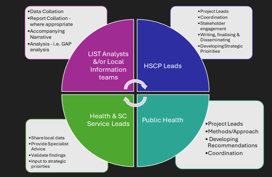 A key part of preparation for undertaking a JSNA is to agree roles and responsibilities for each partner. The diagram below illustrates how key partners could work together to effectively undertake and deliver a JSNA.
