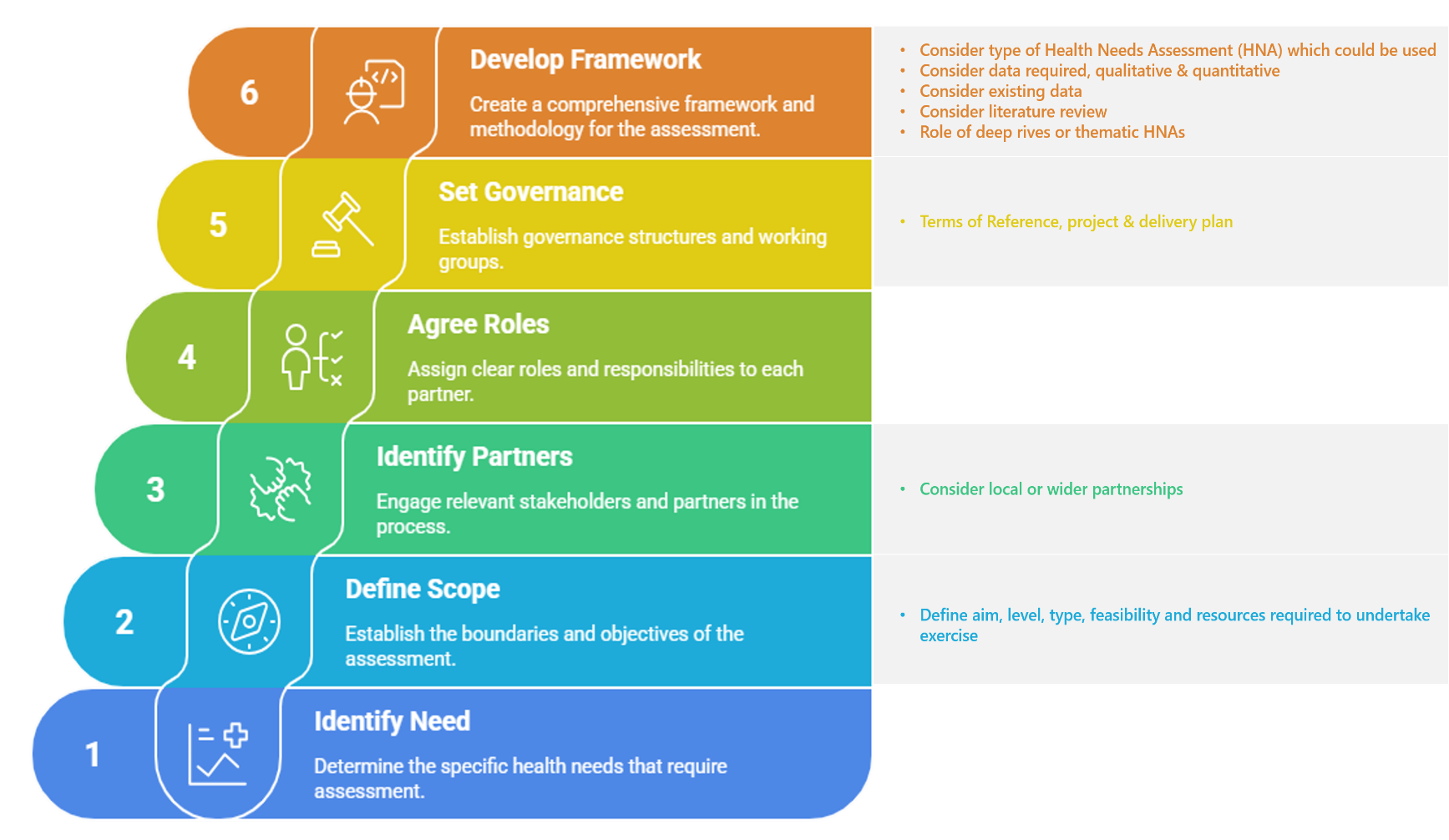 When developing a framework for undertaking a JSNA it is important to consider what type of health needs assessment (Definitions & Terminology) could be useful for informing the your evaluation. It is also important to consider what data both qualitative and quantitative, and lived experience) and evidence is available to inform the your assessment.