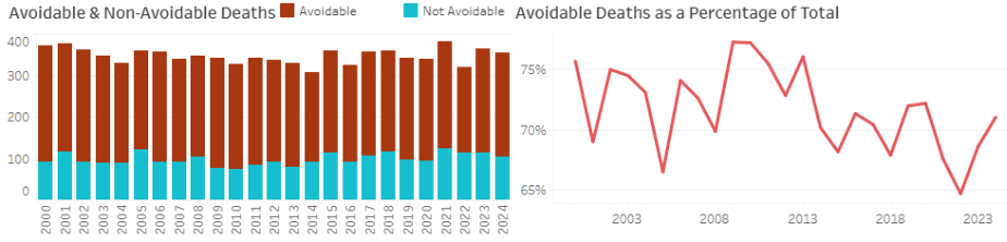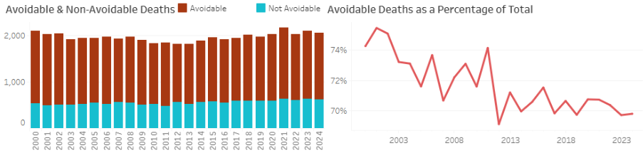 Figure 51 – Trends in avoidable and non-avoidable deaths percentages for Aberdeen City (2000-2024). Click on the image to make it bigger.