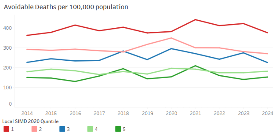 Figure 55 – Preventable Deaths per 100,000 population by SIMD Quintile. Click on the image to make it bigger.