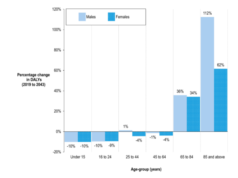 - Despite an overall decline in the projected population in 20 years’ time, the annual disease burden is forecast to increase 21% over a similar period.