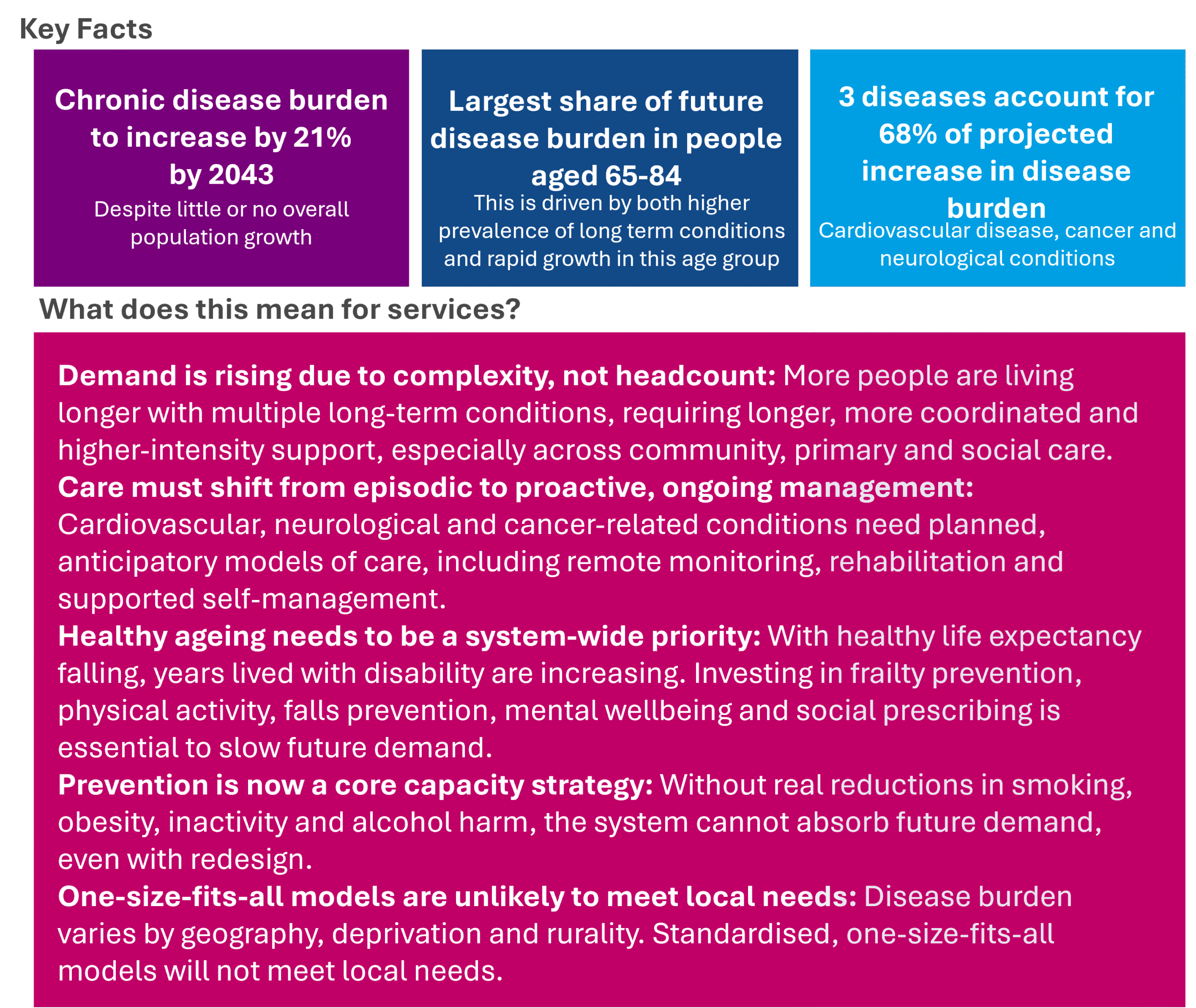 This increase is forecasted to be driven in the main by increases in particular conditions: cardiovascular diseases; cancers; neurological disorders; chronic respiratory diseases; diabetes and kidney diseases; and common infectious diseases. This points to a growing need for preventive action across the life course: tackling obesity, physical inactivity, smoking and alcohol, and improving early detection to prevent the system becoming overwhelmed.