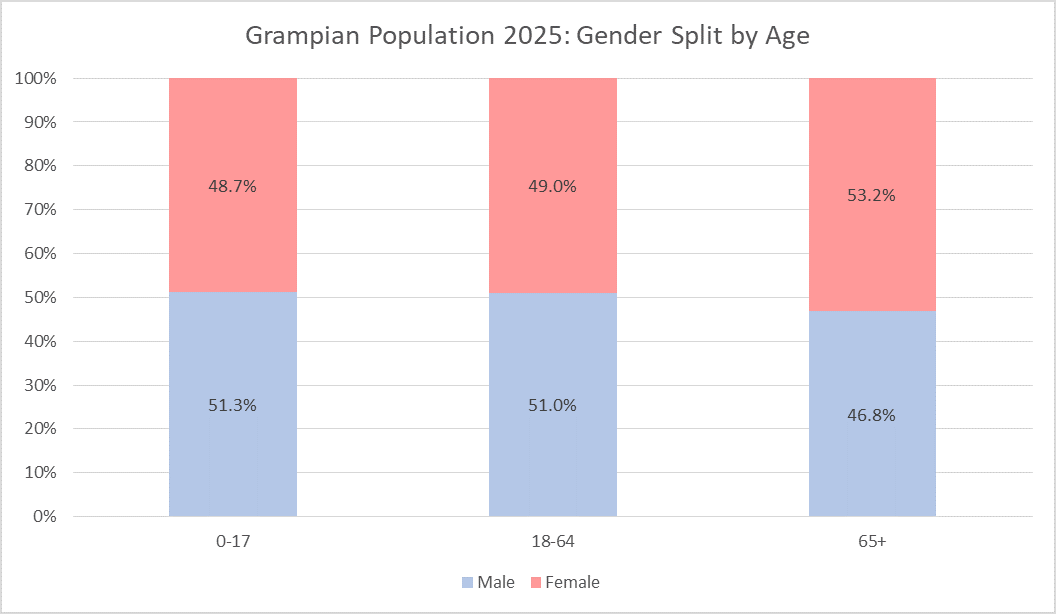 Gender breakdown across the key age groups in Grampian is shown in Figure 7. Just over half the under 18 population and the working age (18-64) is male (51%). In contrast, the older population (aged 65+) the gender split is slightly different as there are more females (53%), reflecting lower life expectancy for males.