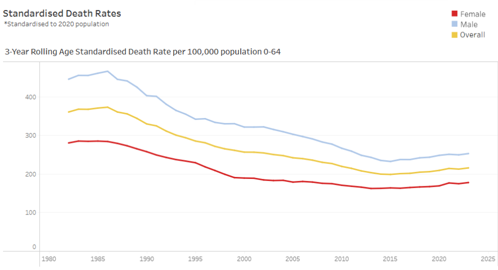 Figure 44 – Trends in age standardised deaths rates (per 100,000 population) for under 65Y population. Click on the image to make it bigger.