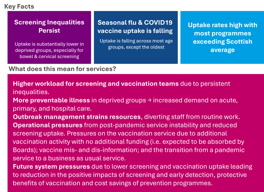 The aim of vaccination is to protect as many children as possible. NHS Grampian’s vaccination campaigns, including autumn/winter COVID-19 and flu, shingles, pneumococcal, RSV and childhood programmes, have consistently achieved high uptake rates, with most cohorts exceeding the Scottish average. Although vaccine rates are generally high there are pockets of low uptake, mainly in the urban areas linked to deprivation.