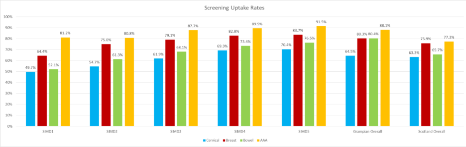 Figure 56 – Cervical, Breast, Bowel and AAA Screening Uptake Rates by SIMD Quintile. Click on the image to make it bigger.