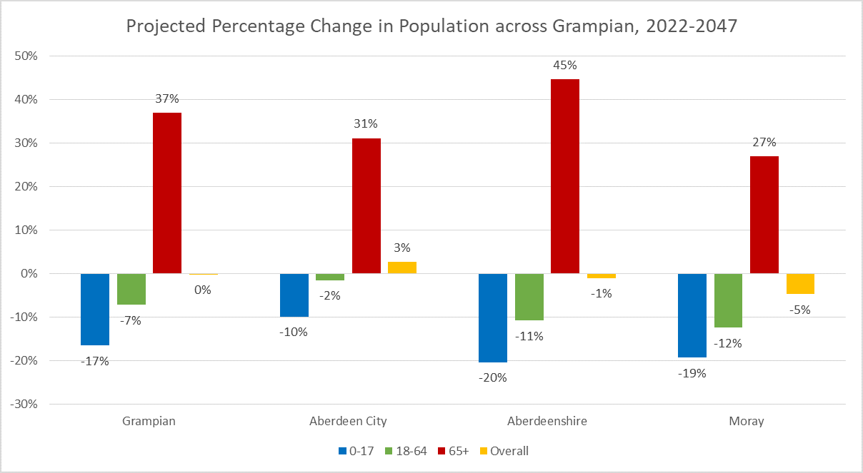 While no increase in the total population is projected, big changes are expected in demographics with the over 65 population predicted to grow by 37%, and as much as 45% in Aberdeenshire. A large drop in the under 18 population has been modelled, particularly in Aberdeenshire and Moray, with these areas also seeing decreases of over 10% in the working age population.