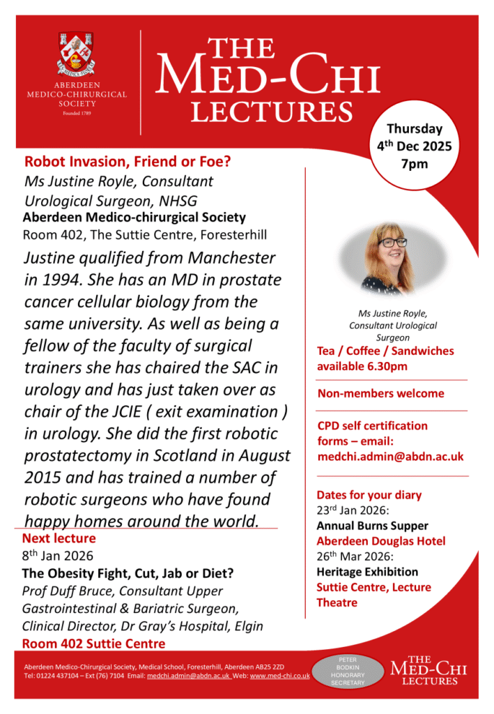 The next lecture will take place on Thursday 4th December 2025 at 7pm in room 402 of the Suttie Centre. The speaker will be Ms Justine Royle, Consultant Urological Surgeon, NHSG.
